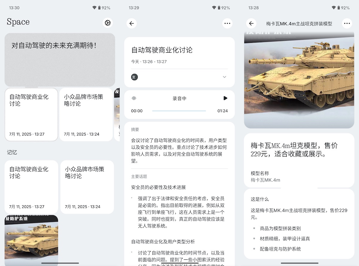 手机锁定键下方有一颗专属的 Essential Key,可见这个 AI 功用的重要性。单击这颗按钮便能截屏并将其保存至 Essential Space,长按的话则是发动语音备忘录,会主动转为文字。比方下方所示的运用场景: