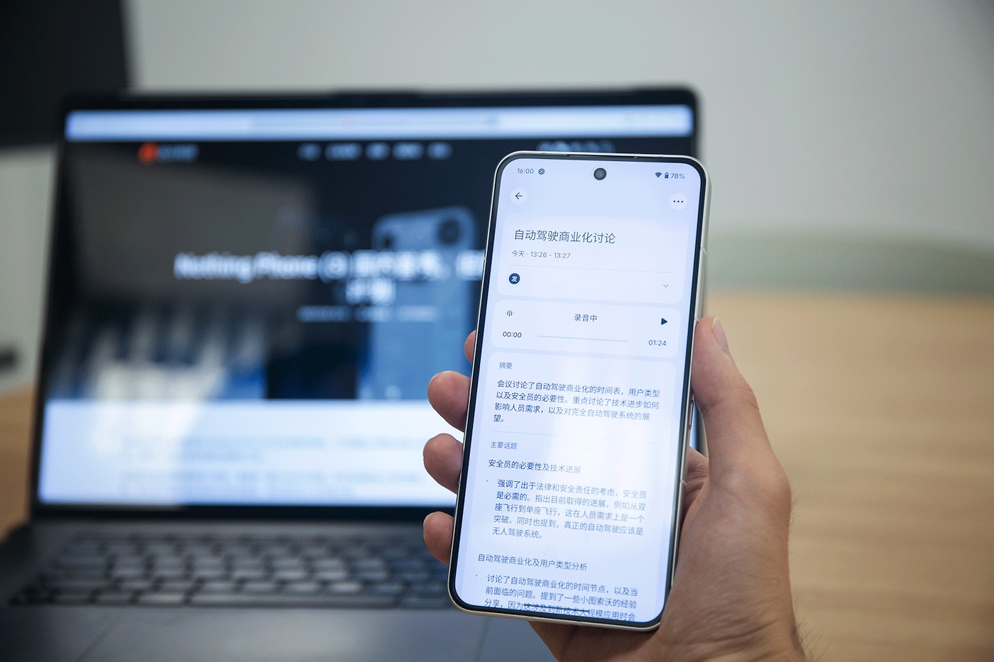 翻转录音是另一个和 Glyph 矩阵强相关的功用。长按 Essential Key 并翻转手机,就会发动会议录音形式,一起矩阵屏会显现录音状况与波形图,做到“低沉地提示发言人”这儿正在录音嗷。像干流的录音转录东西那样,体系会主动识别发言人,并总结提炼内内容关键、生成摘要。