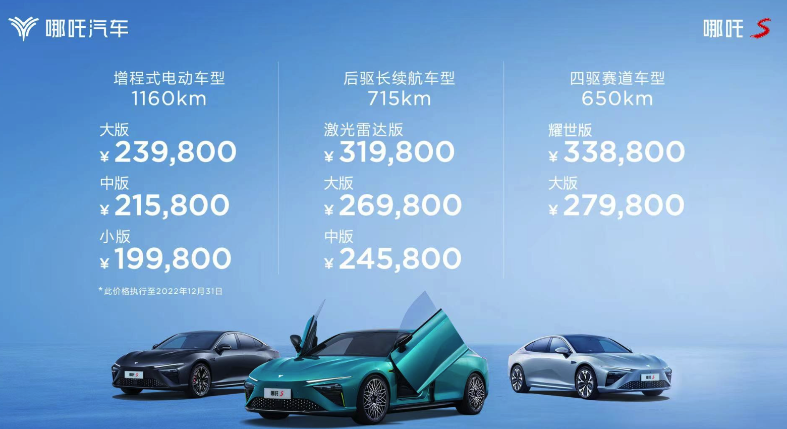 哪吒S正式上市出售,包含增程式电动车型哪吒S 1160大版、哪吒S 1160中版、哪吒S 1160小版;四驱赛道车型哪吒S耀世版、哪吒S 650四驱大版;后驱长续航车型哪吒S 715激光雷达版、哪吒S 715大版、哪吒S 715中版共八款车型,官方辅导价格为19.98万元-33.88万元。