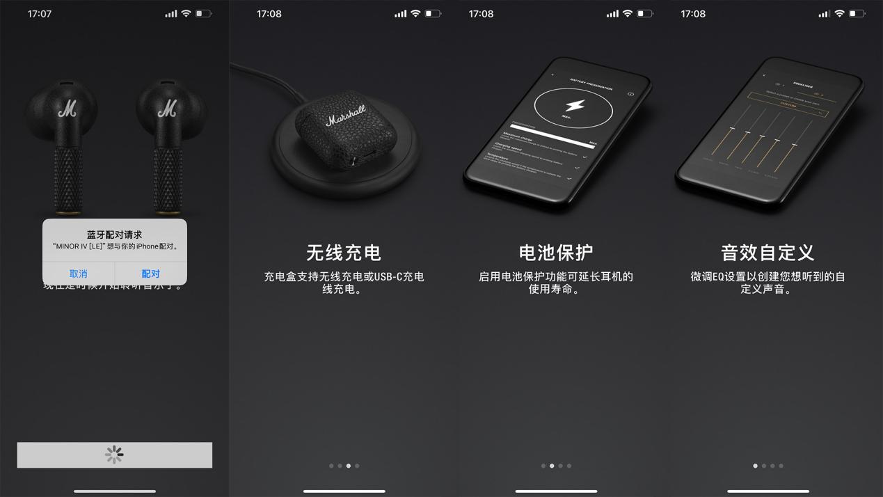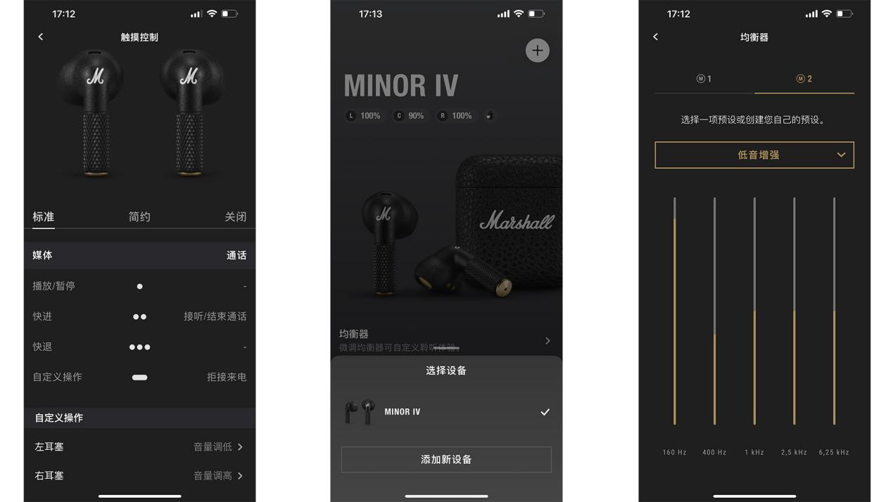 在手机的蓝牙列表中挑选MINOR IV,即可将耳机与手机进行配对衔接。交互的界面相同也做得十分简练。在Marshall Bluetooth App中,还可以进一步对接触操控的设定、均衡器作用进行个性化的预设。